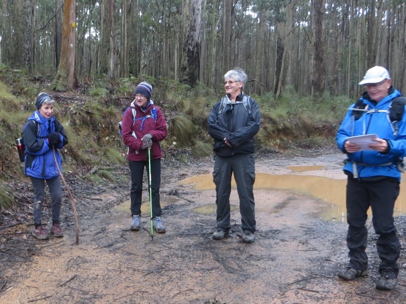 We finally set off on the hike, dressed for anything that the weather could throw at us, but we were pleased to find all the rain had fallen the night before. The initial bush tracks were determined to not agree with the GPS unit but became more compliant when threatened with a map and compass. Andrew’s regular phone calls from the leading Blue group provided useful extra information on the tracks ahead of us.
