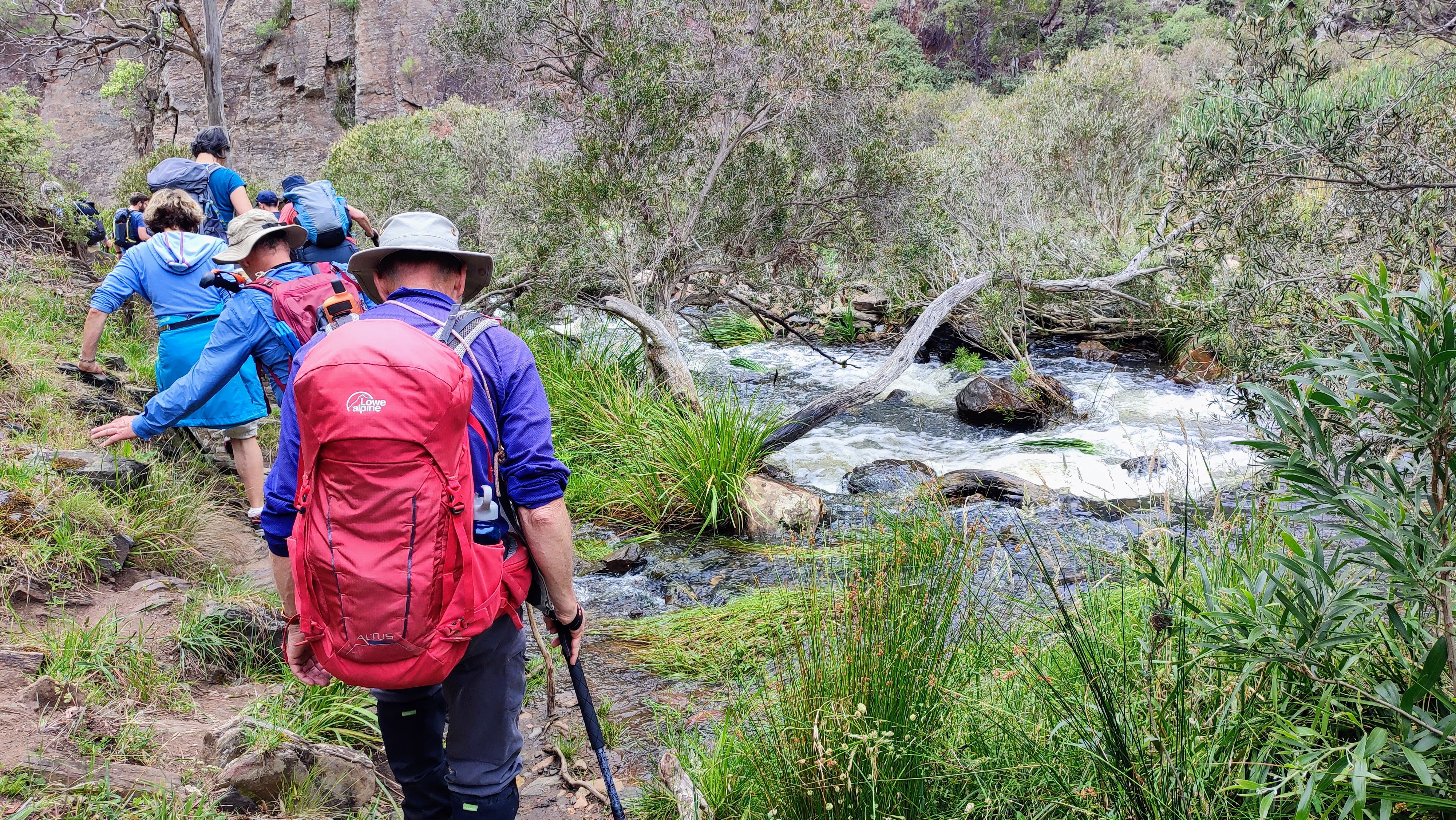 By Stop Four, with downhill territory now in sight, we began to hear the rushing of the Werribee River, and watched a bush wallaby nonchalantly chewing its breakfast, oblivious to our presence. Downhill proved hard work with rocky terrain requiring careful footwork. Reaching both Needle Beach and Lionhead Beach provided some relief from the ankle breaking descent, and we spent some time trying to spot Peregrine Falcons and Wedge Tailed Eagles high in rocky lofts. No luck today. Instead, we applied our imaginations trying to identify the Lionhead formation in the dramatic rockface opposite us. This formation, according to Parks Vic notes, was a result of massive geological upheavals known as synclines comprising horizontal layers of soil deposits, and compressed by massive tectonic plate movements. All this activity took place 350 million years ago, presumably with the Lionhead relief sculpted sometime during this geological period. Curiously, the Lionhead only became recognisable for some, after we took photos, created in a matter of nanoseconds. Time certainly has a different meaning here.